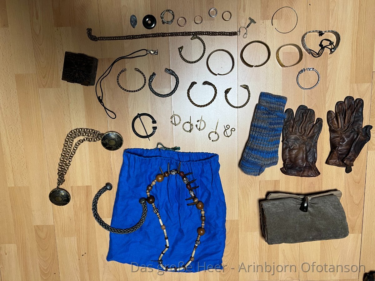 13. Schmuck!!! Viel davon teilweise aus echtem Silber ( und meine Besteckrolle die eigentlich zu den Schüsseln sollte, Socken die zu den Schuhen sollten sowie die Handschuhe die zum Kettenhemd aufs Bild sollten )