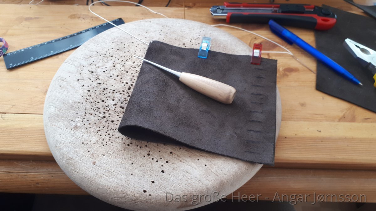Zunächst mal müssen wir unsere späteren Nahtlöcher vorstechen, dafür nutzen wir eine Unterlage aus Holz. Ein handelsübliches Schneidebrett oder ein Stück Restholz von anderen