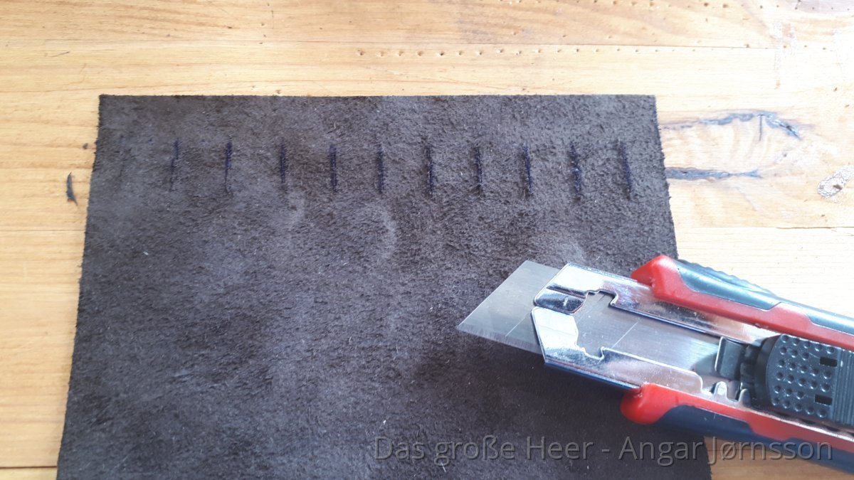 einer geeigneten Schere. Anschließend schneiden wir mit dem Cutter jeweils 11 Schlitze an den beiden Enden des Lederstücks senkrecht zur Längstseite. Durch diese Schlitze wird am Ende