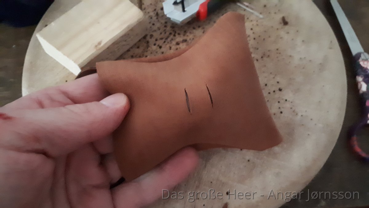 Dazu schneiden wir uns einen etwa 16-20cm langen und etwa 1,5cm breiten Lederbändel aus derselben Lederhaut ab. Die Breite des Lederbändels sollte zur abgeflachten Spitze des Taschenverschluss passen.