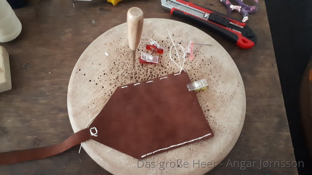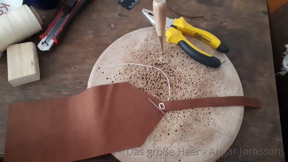 Aus welchem Material das Original gefertigt ist, konnte ich, in Ermangelung des vollständigen Fundkatalogs, leider nicht ermitteln. Letztlich wird es sich wohl um Ziegen oder Rindleder handeln.
