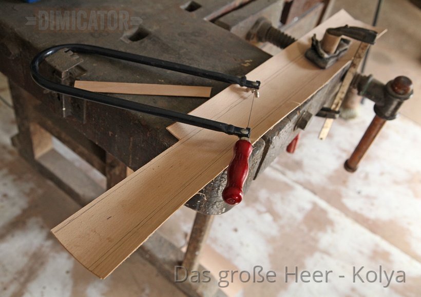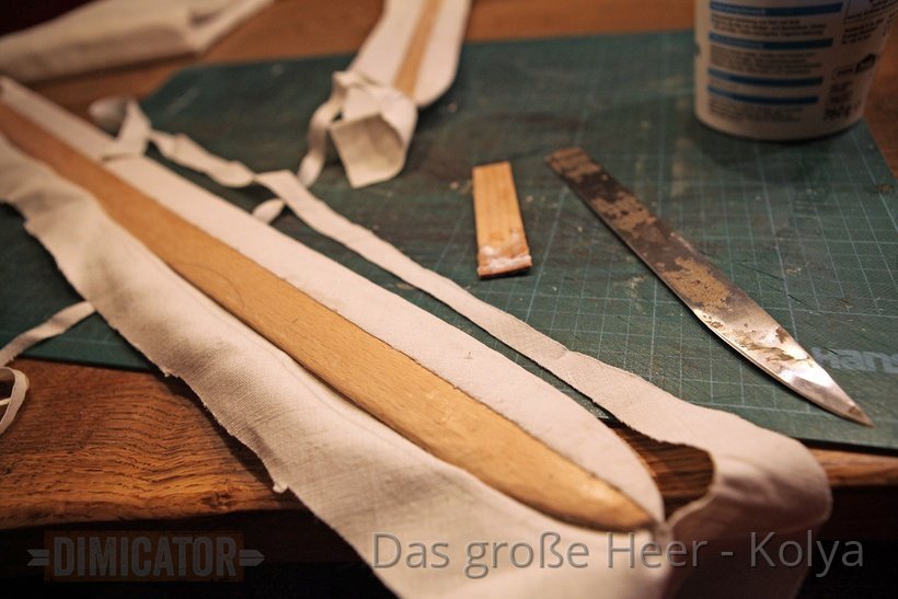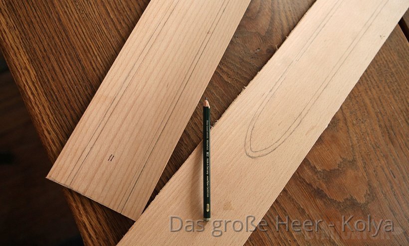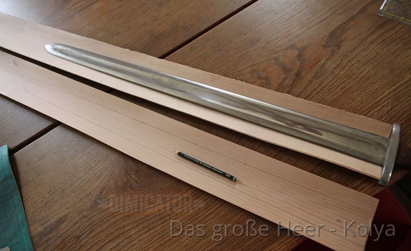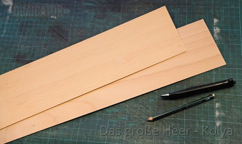 For each scabbard half you need two thin wooden boards, 1 mm thick each, about 10 cm wide and at least as long as your final scabbard. I ordered according boards from this supplier for model making. I am sure there are comparable vendors elsewhere.