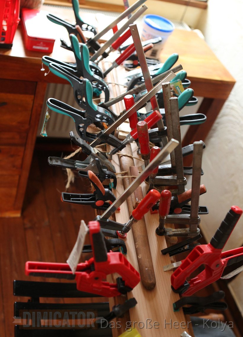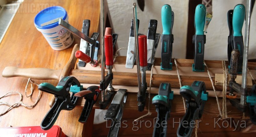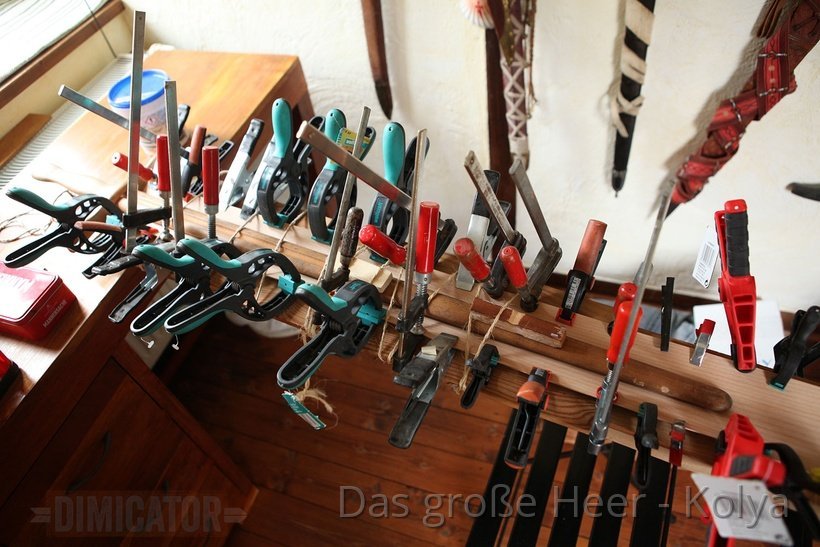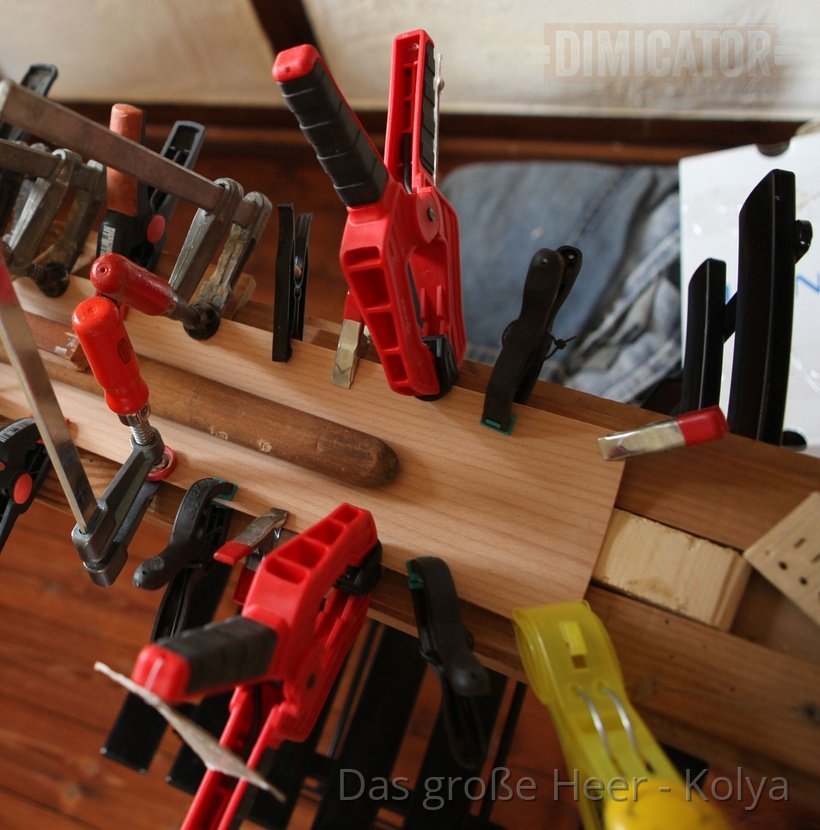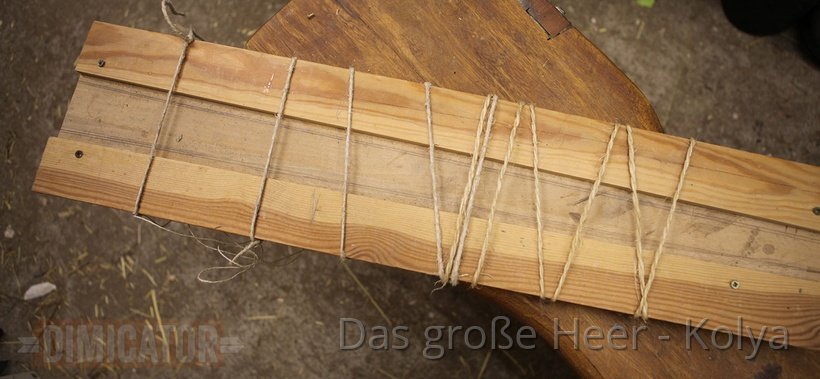 I use a wooden training sword to evenly press them down. The waister is kept in place by strings wound around the construction, and by bar clamps.
