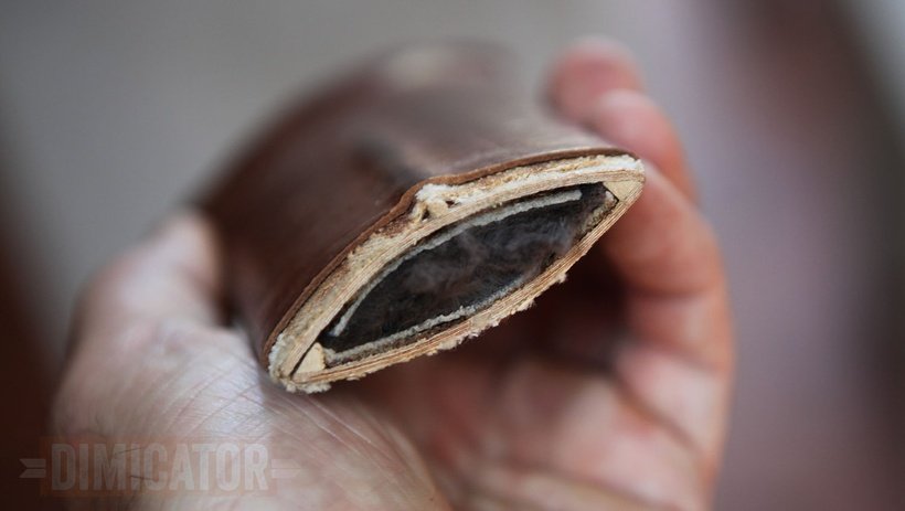 From inside to outside, you see a fur lining (optional), the wooden core consisting of two-ply wood (mandatory) and additional lath edges (optional), plus a wooden strip as a raiser (optional). The core is covered with textile (mandatory), and finally with leather (optional). You can, of course, leave out the textile and use leather as a stand-alone facing, but you do need at least one facing to provide stability and durability.