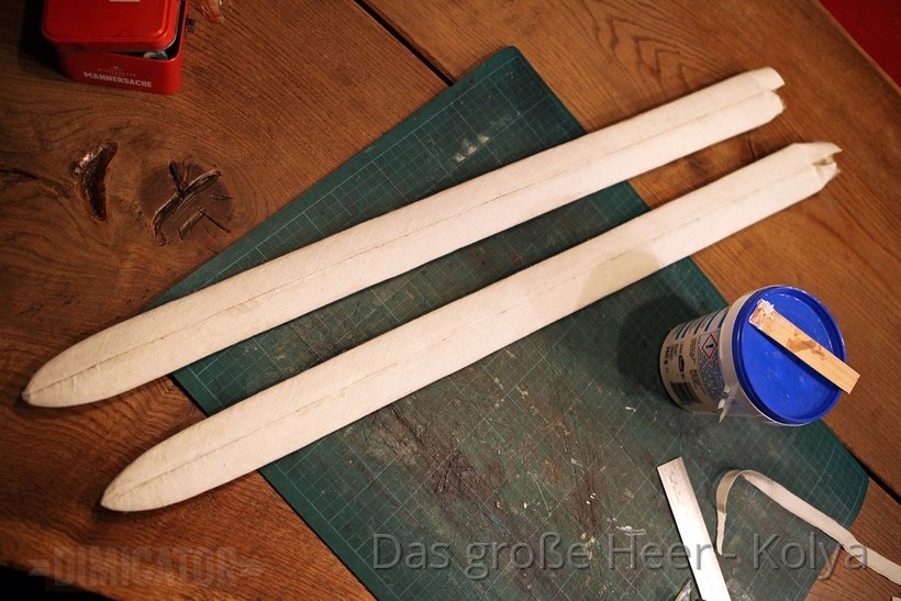 At this point you must absolutely resist the temptation to insert your sword. There is a danger that the joined edges will crack open. So wait until you have attached a facing which will keep halves firmly together.