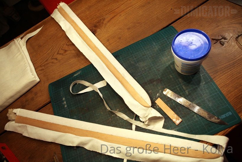 First I glue the fabric’s center to the front of a scabbard.