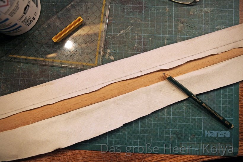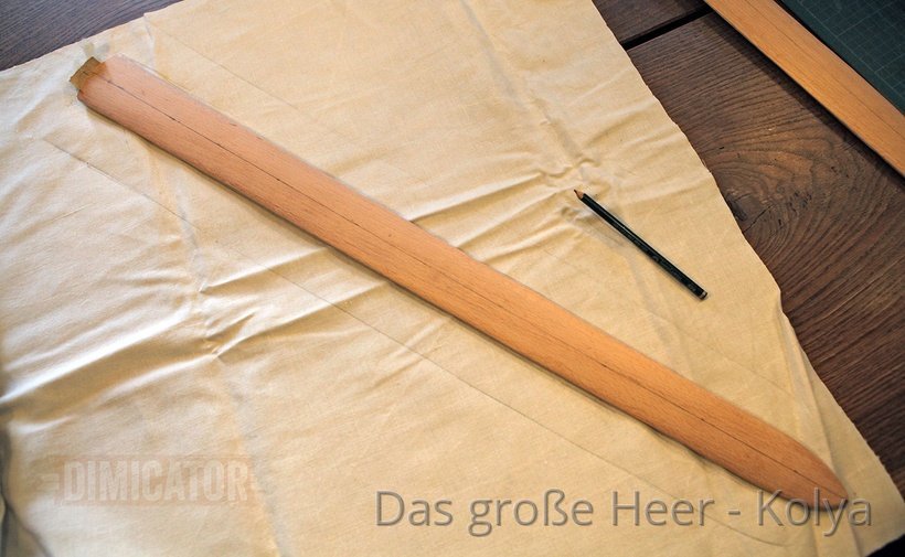 Note that I placed the scabbard on the cloth at an angle. This way I can use a fabric’s natural flexibility when wrapping it around the core. At right angles, there would be no flex.