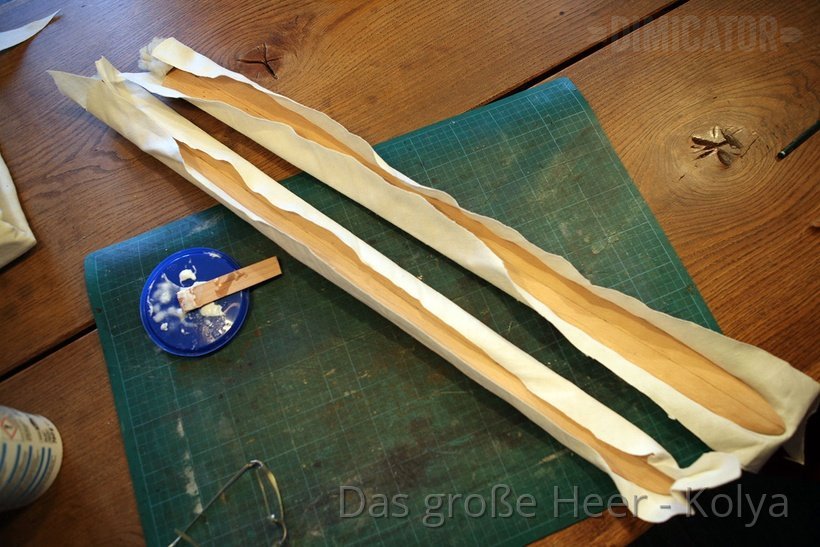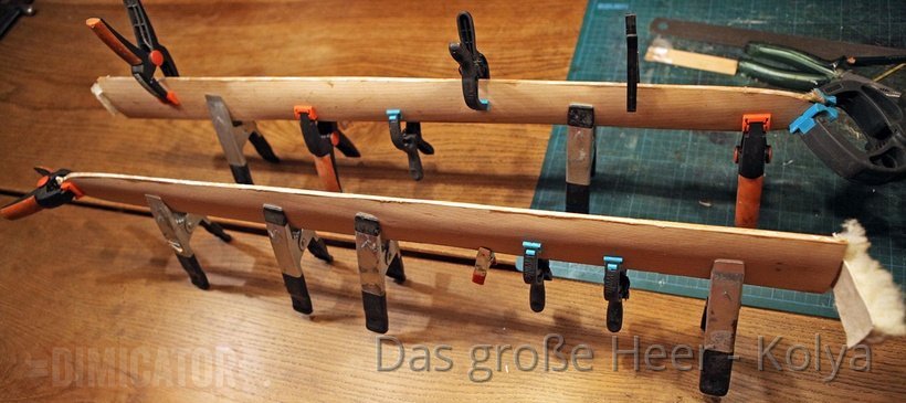 I also pushed a piece of wood under one end to fold up the boards on the side where the scabbard point will be situated later. However, this kind of fine tuning is not actually required at this point.