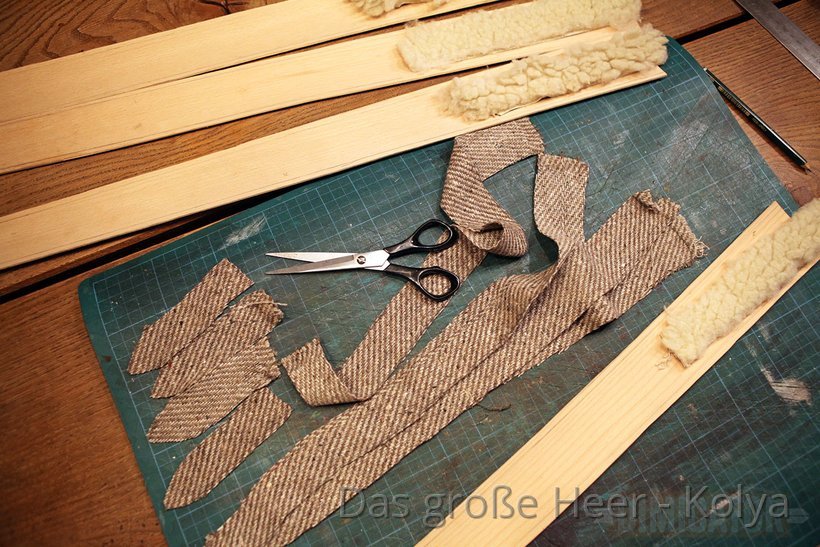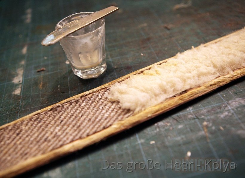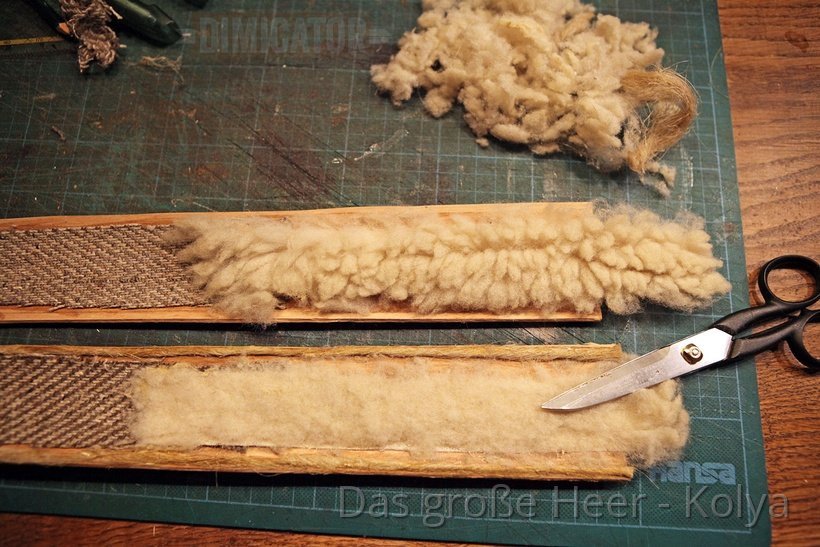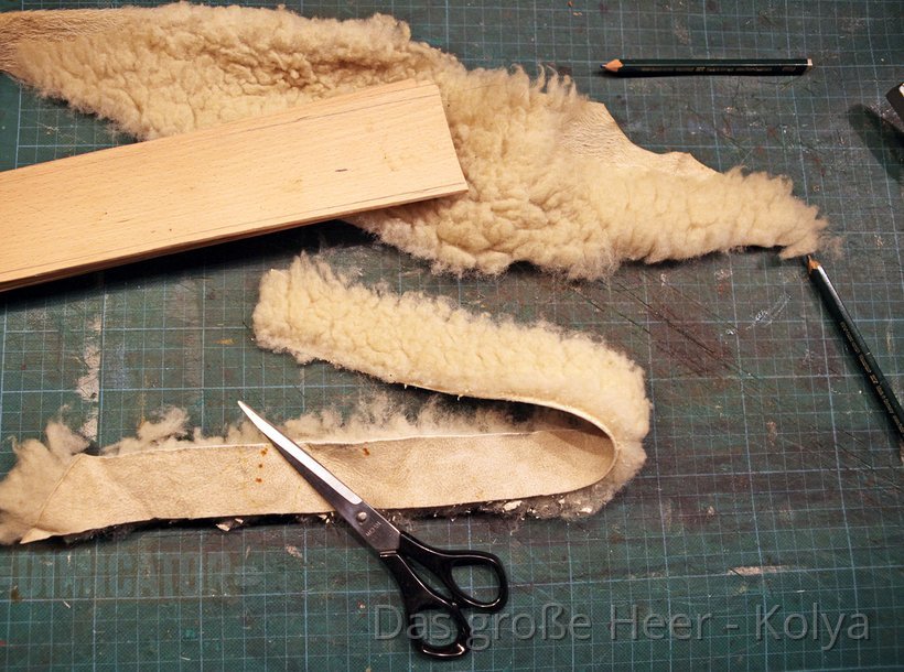 For the lining of the scabbard mouth, I cut strips from sheepskin. A lining is not actually required for your blunt training sword. But it does help to secure the sword, and it polishes the blade each time you draw or sheath it. A lining also holds together a snapped scabbard core from the inside, so you could still use it. Something that might be a comforting thought for battle re-enactors.