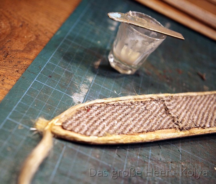 Glue produces fumes for quite some time. So any adhesives used on the inside of your scabbard should be free of acid to not corrode the surface of your sword blade. I used casein glue which is a historical glue that creates a strong bond and is waterproof.