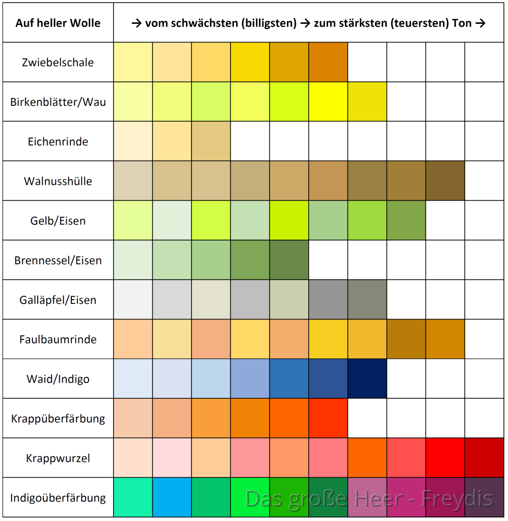 - Färbungen durch Exotenhölzer sind für das Frühmittelalter nicht nachgewiesen, also sind extreme Töne wie von Blauholz, Cochenille oder Annattosaat unpassend.