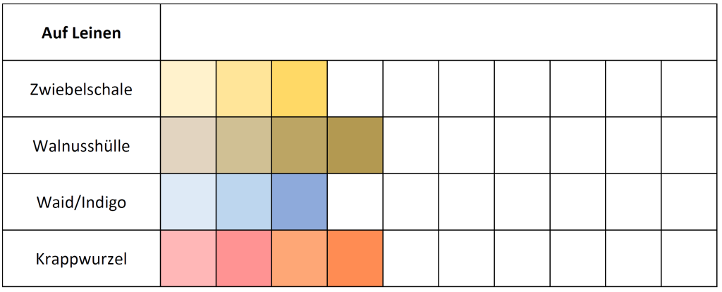 - Leinen lässt sich nur mit sehr intensiven Färbemitteln minimal einfärben, bspw. Krapp und Inidgo, daher raten wir von gefärbtem Leinen (abgesehen von den in der zweiten Tabelle genannten Farbtönen) ab. Wenn es Leinen sein muss (z.B. für das Leibhemd), ist naturfarbenes ausdrücklich erwünscht!