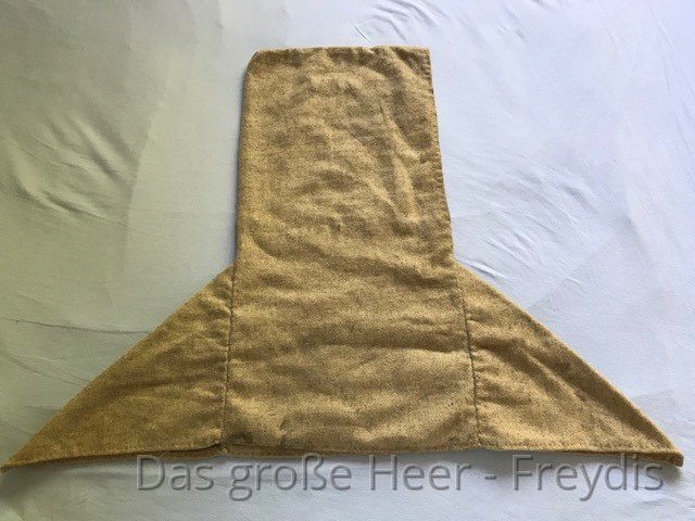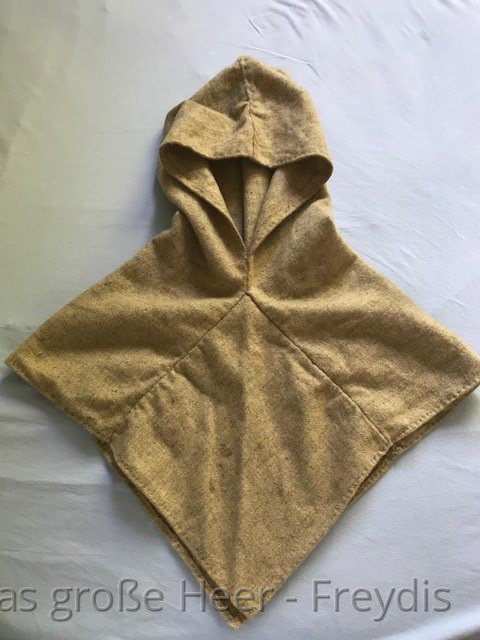 Sie schützt vor Regen und verhindert den Wärmeverlust über den Kopf und Hals. Die von uns verwendeten Schnittmuster orientieren sich an den Interpretationen der Fragmentfunde aus Haithabu und Skjoldehamn.