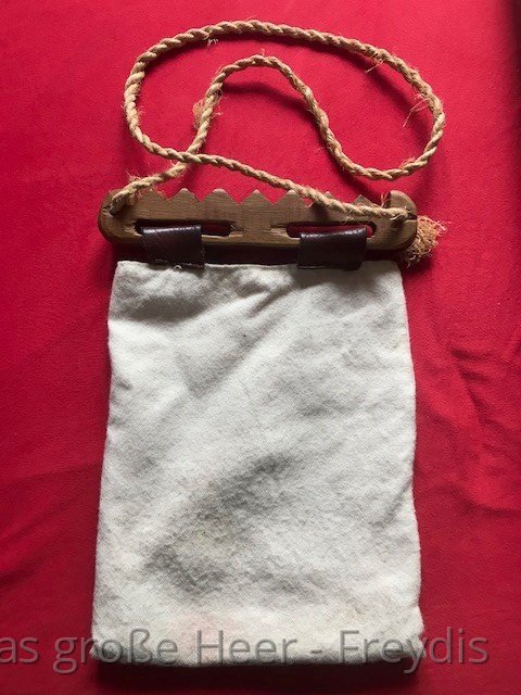 Der Plünderbeutel ist eine Umhängetasche. Sie ist sehr einfach zu nähen, da es sich um ein rechteckiges Stück Stoff (Wolle und/oder Leinen) handelt, welches zweimal gefaltet und an zwei Seiten zusammengenäht wird. Trageriemen dran – fertig! Die Größe und Ausstattung richtet sich ganz nach den eigenen Bedürfnissen. Ist der Plünderbeutel gut genäht, kann man sogar mehrere Wasserflaschen darin zum Schlachtfeld schleppen. Hier gibt es die Anleitung: Einen Plünderbeutel nähen.pdf