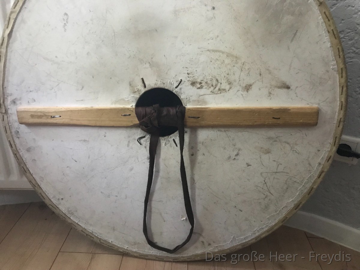 Empfehlenswert ist es einen Riemen oder Seil am Mittelgriff zu befestigen um den Schild bei Nichtgebrauch auf dem Rücken tragen zu können. Zum Einen gibt das ein stimmiges Bild und zum Anderen hat man die Hände frei um Belagerungstürme zu schieben, Verwundete zu bergen etc..