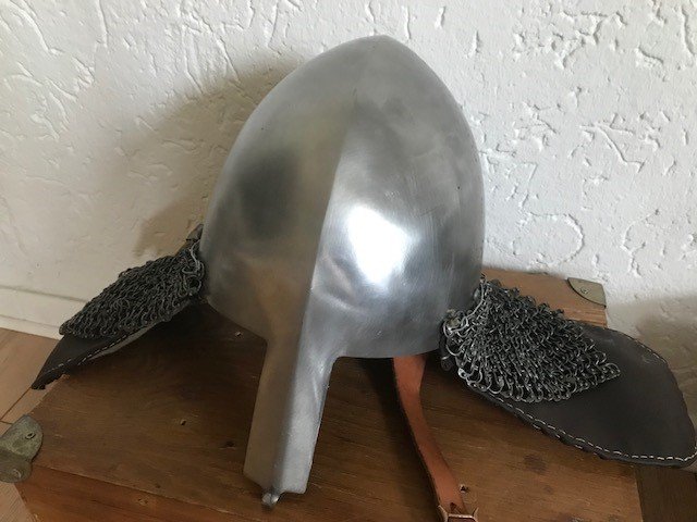 Typische Helme der Wikingerzeit, sind entweder aus einem Stück gefertigt, oder aus 2-4 Teilstücken und mit sogenannten Spangen verbunden. Bsp. für Helme: Nasalhelm Typ St. Wenzel, Nasalhelm Typ Ostrow Lednicki, Spangenhelm.