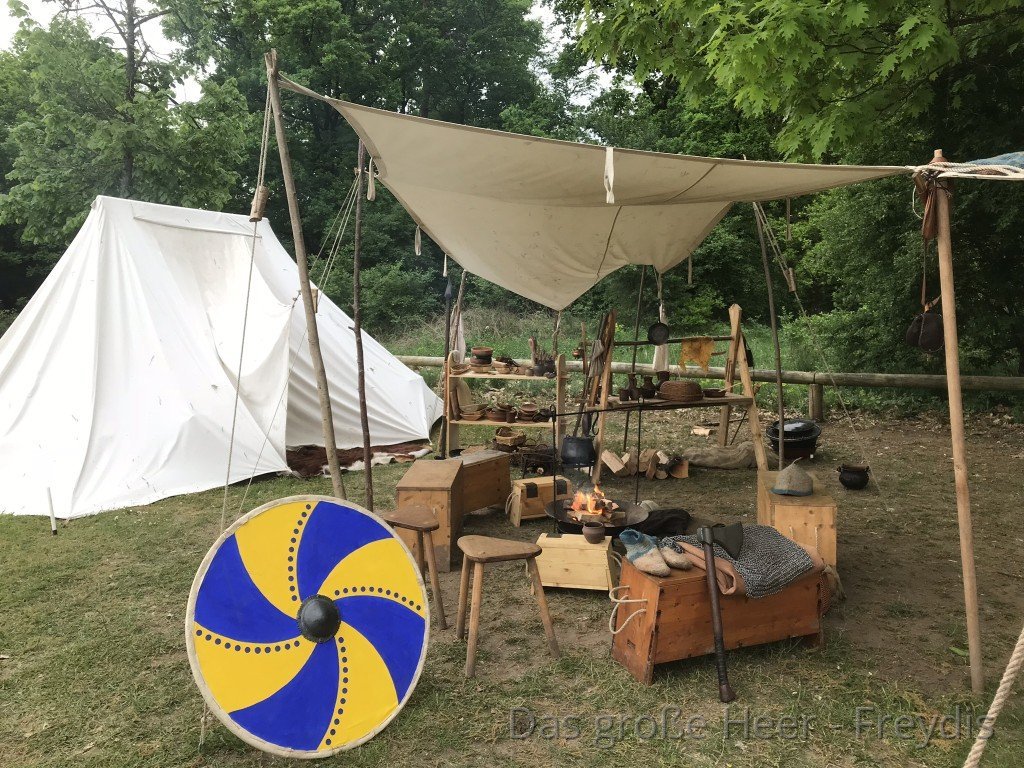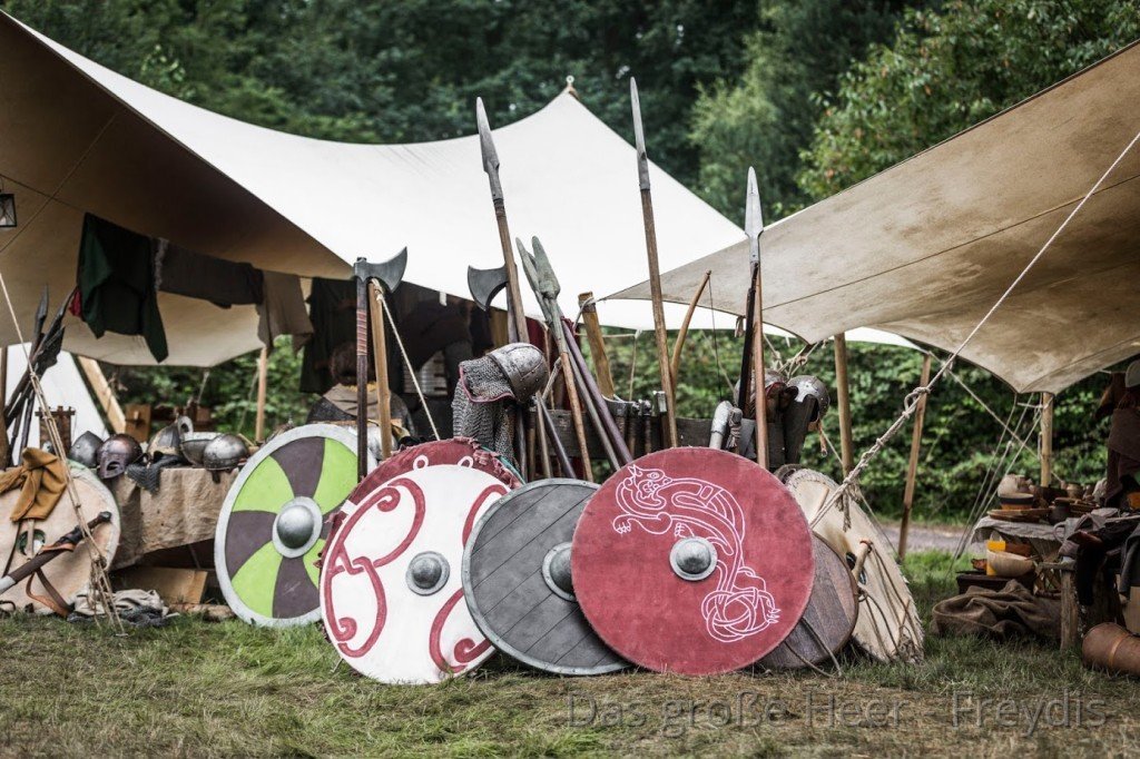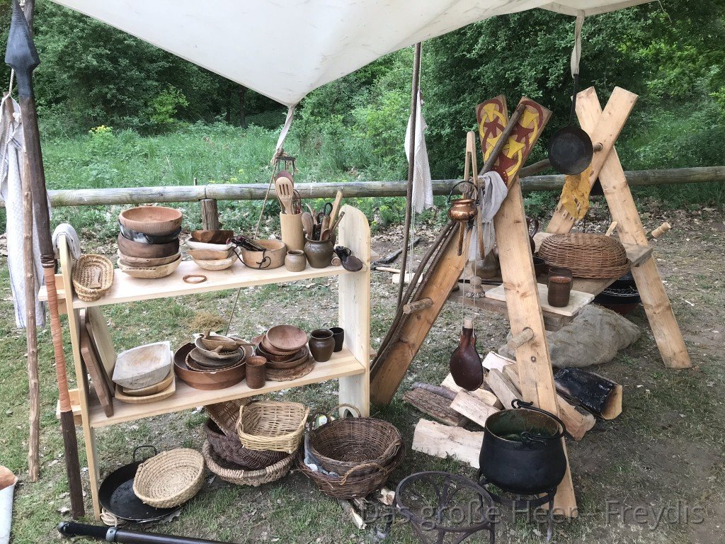 Sehr nützlich für die Lagerordnung erweisen sich Waffenständer (diese können leicht vor Ort gebaut werden), ein Geschirrregal/Beistelltisch aus Holz zum Ablegen. Tische, Bänke oder Thron für den Anführer sind Geschmackssache. Manche Gruppen haben lieber einen Sitzkreis aus Ruderkisten um die Feuerstelle herum, das sieht dann mehr nach Heerfahrt und nicht nach Glamping aus.