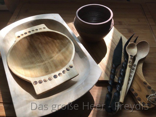 Du brauchst einen schönen Becher aus Ton oder Holz (kein Trinkhorn und erst recht kein Trinkhornhalter am Gürtel) und idealerweise einen Ersatzbecher. Außerdem Holzgeschirr und Essbesteck, das Du erschwinglich in allen möglichen Larp-Läden und Mittelalterbedarf-Shops bestellen kannst.